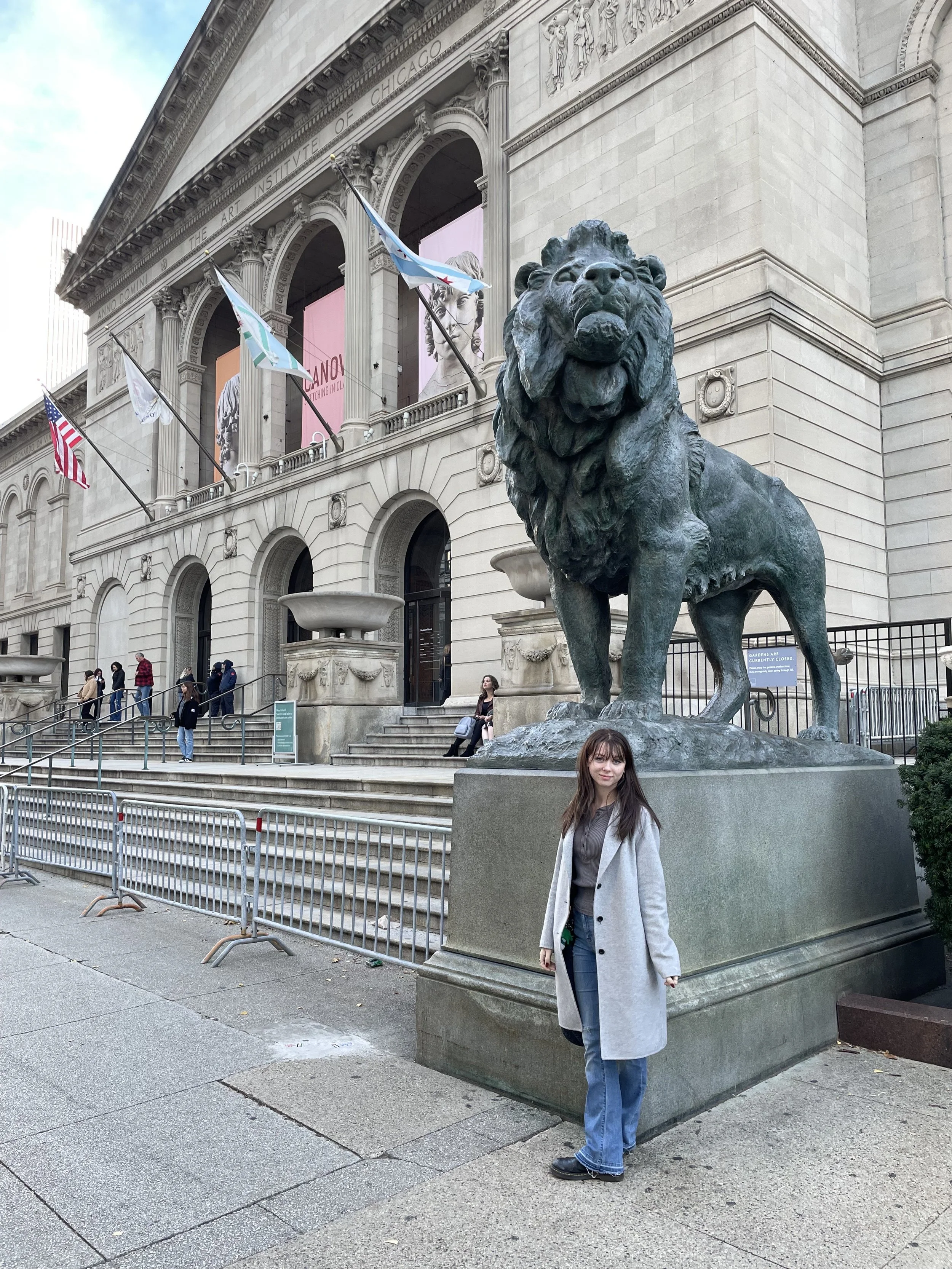 Girl with brown hair in long coat stands beneath lion sculpture outside the Chicago Modern Museum of Art.